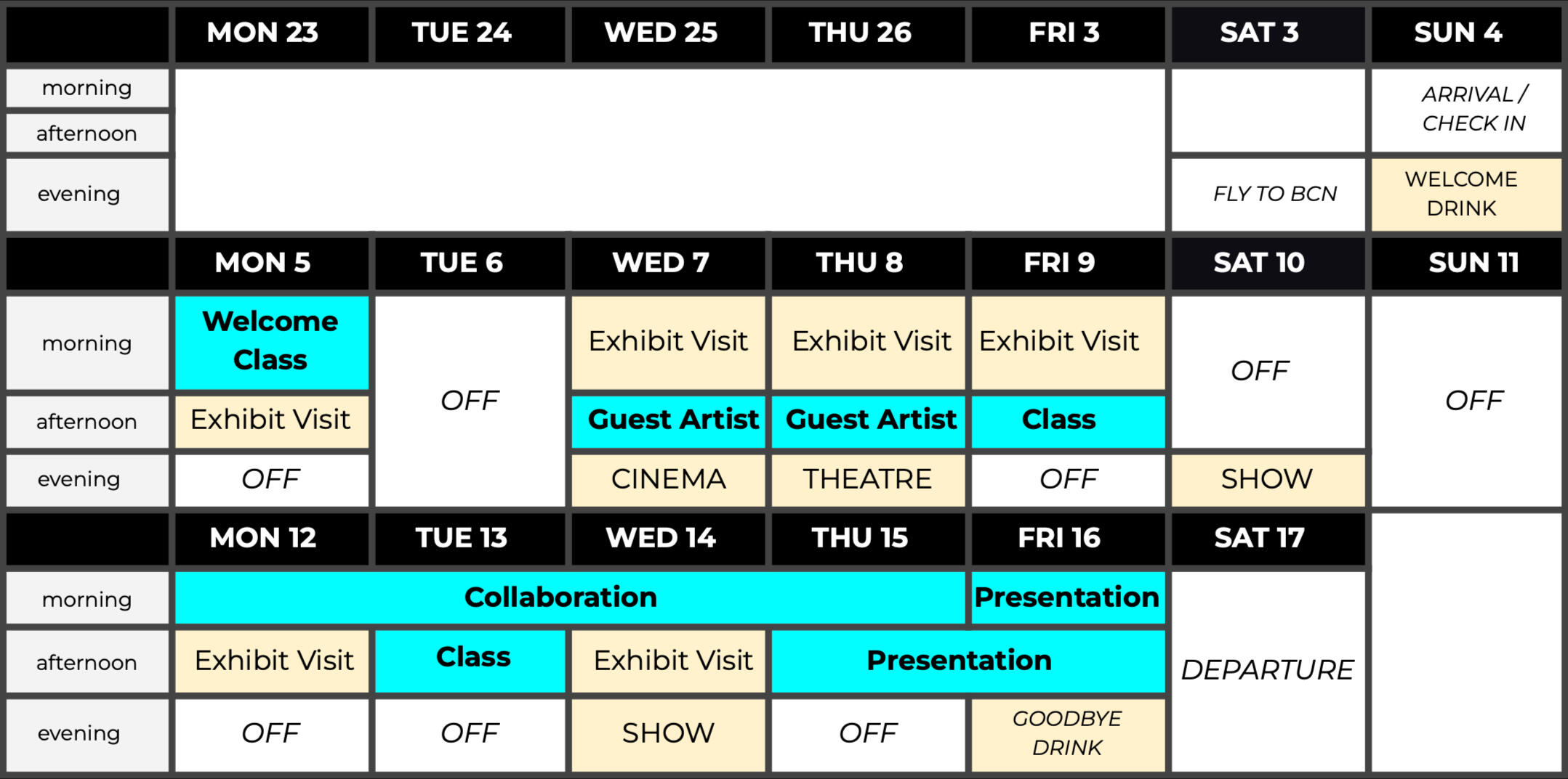 WHY JOINBuild meaningful connections within Barcelona’s vibrant artistic communityExpand your creative practice through hands-on experiences and collaborationGain cultural fluency by engaging deeply with the city’s history, language, contrasts, and living cultureReturn with new confidence, fresh perspectives, and an interdisciplinary portfolio of work