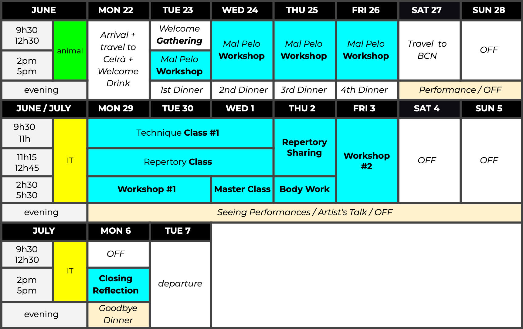 | 1 | . | . | . | . | . | FLY to BCN | ARRIVAL / check in / WELCOME DRINK |