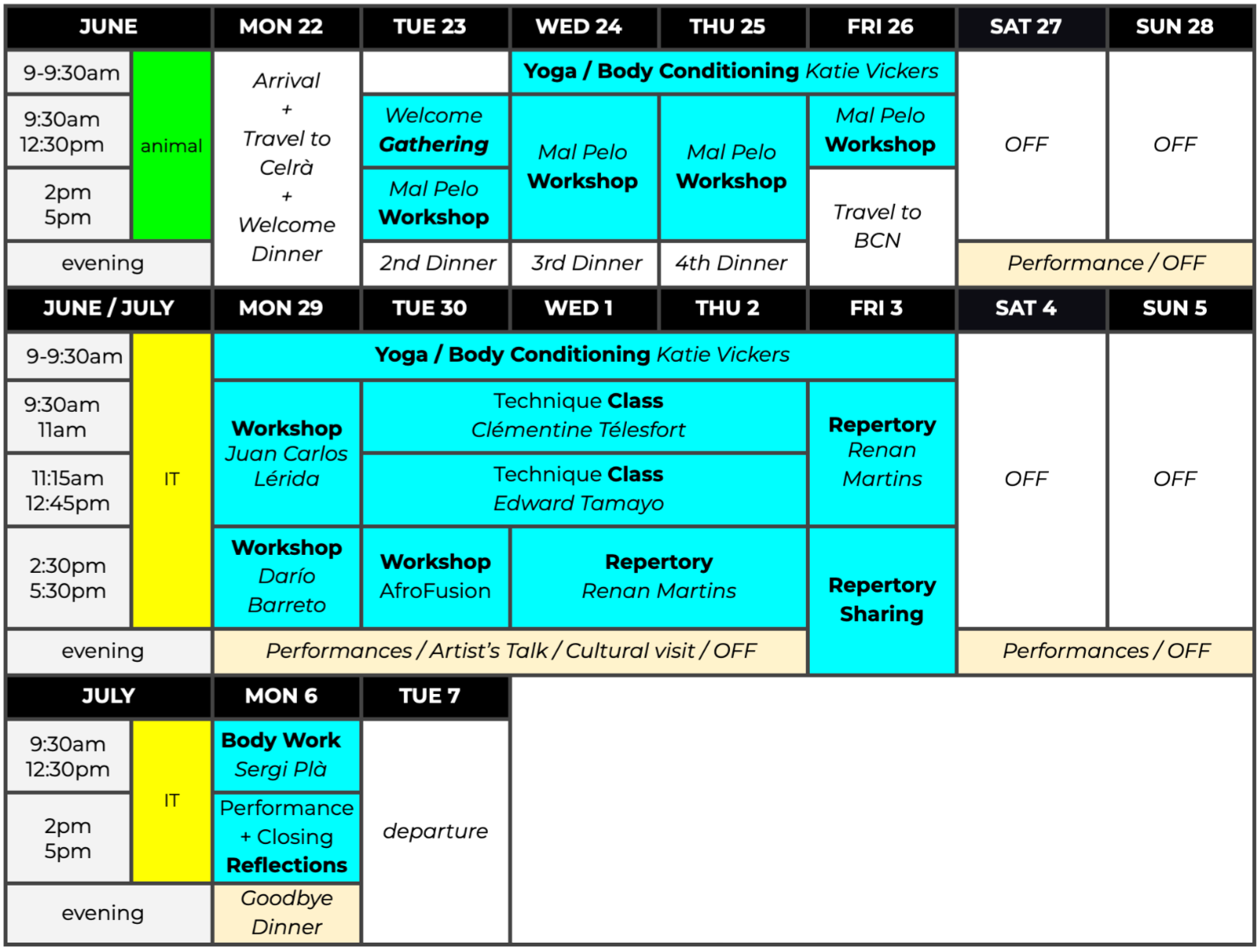 This 10-day immersive intensive is designed for musical theatre students seeking advanced training in embodied performance, physical intelligence, and ensemble-based creation. Set in Barcelona—a city with a rich lineage of experimental performance, visual art, and embodied research—the program is grounded in clowning, physical theatre, and contemporary dance, prioritizing presence, risk-taking, precision, and clarity of physical expression as core performance skills.Daily studio practice includes