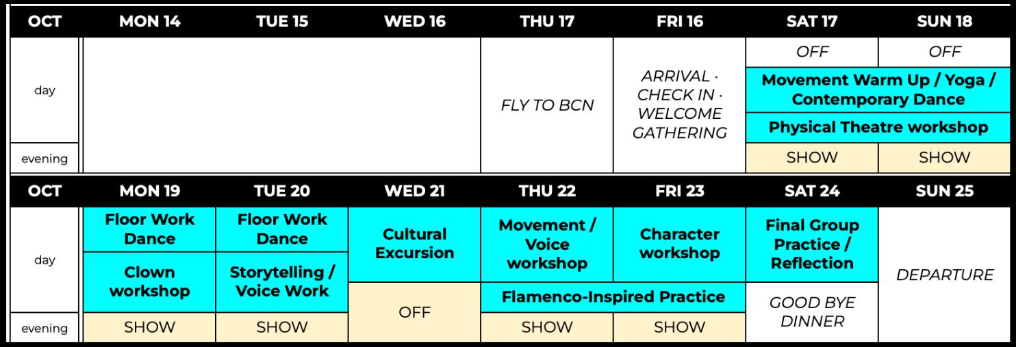 Influences from flamenco, contemporary dance, and physical theatre to support grounding, musicality, and expressive rangeStudents engage in guided improvisation and ensemble composition, generating original material while refining comic sensitivity, emotional availability, and performative presence. These skills directly support musical theatre performance, audition work, and devised practices.The program also includes evening performances and cultural excursions, situating studio work within Barcelona’s vibrant performance ecology.